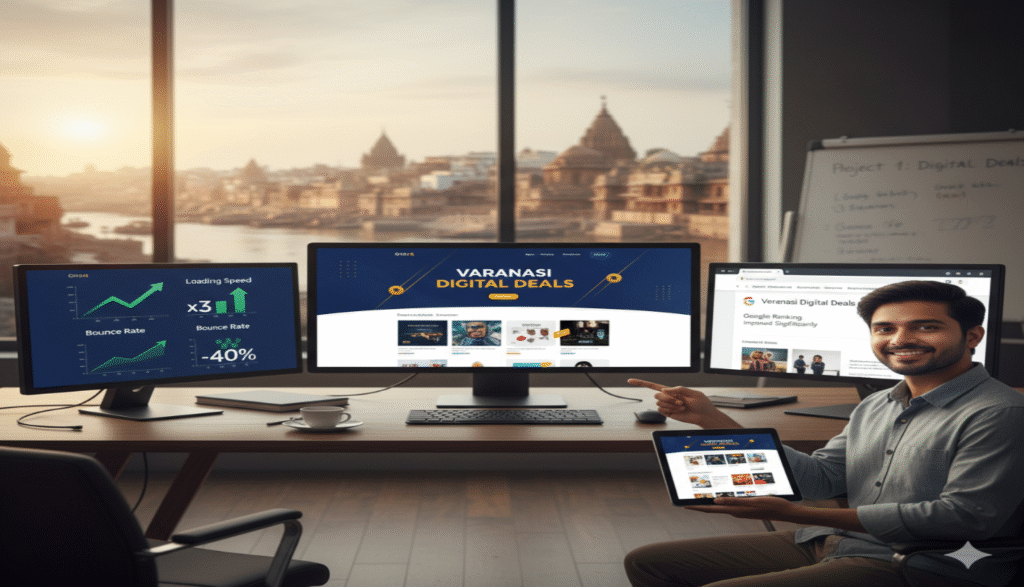 Project 1: Website Redesign for Local Startup Client: Varanasi Digital Deals Challenge: Their old WordPress site was slow, unoptimized, and lacked visual appeal. My Role: I redesigned the entire layout, optimized loading speed, and improved SEO performance. Result: The site now loads 3x faster, bounce rate dropped by 40%, and Google ranking improved significantly.