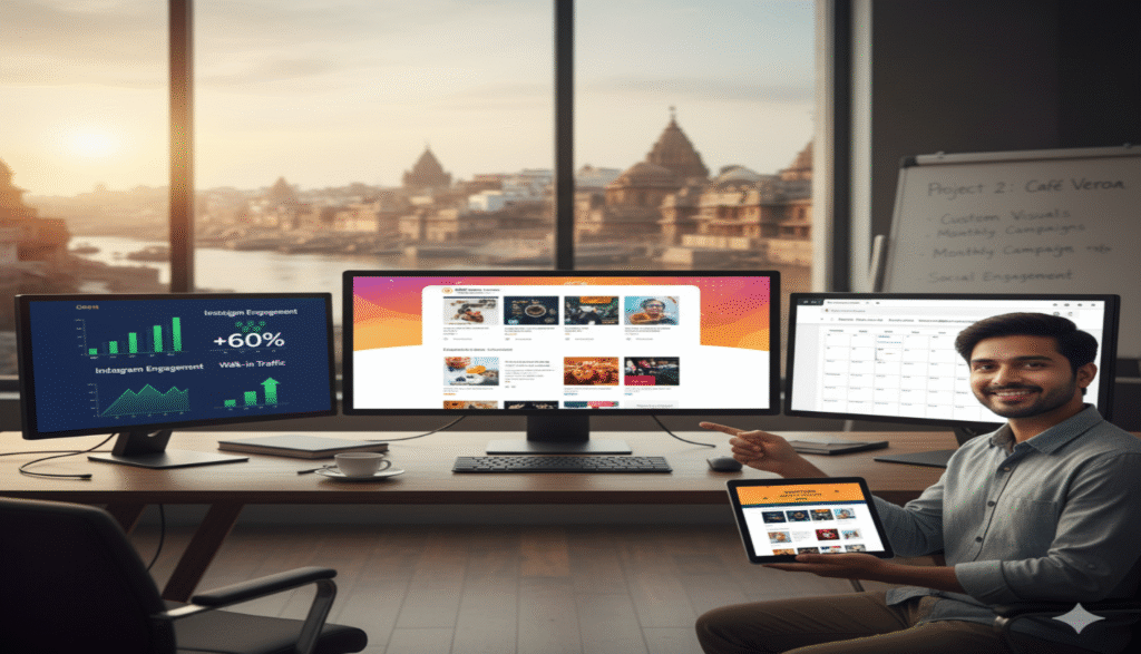 Project 2: SMO Strategy for Café Brand Client: Café Verona, Varanasi Challenge: They wanted better social engagement and brand identity. My Role: I created custom visuals, planned monthly campaigns, and managed posting schedules. Result: Their Instagram engagement jumped 60% within three months, with higher walk-in traffic.